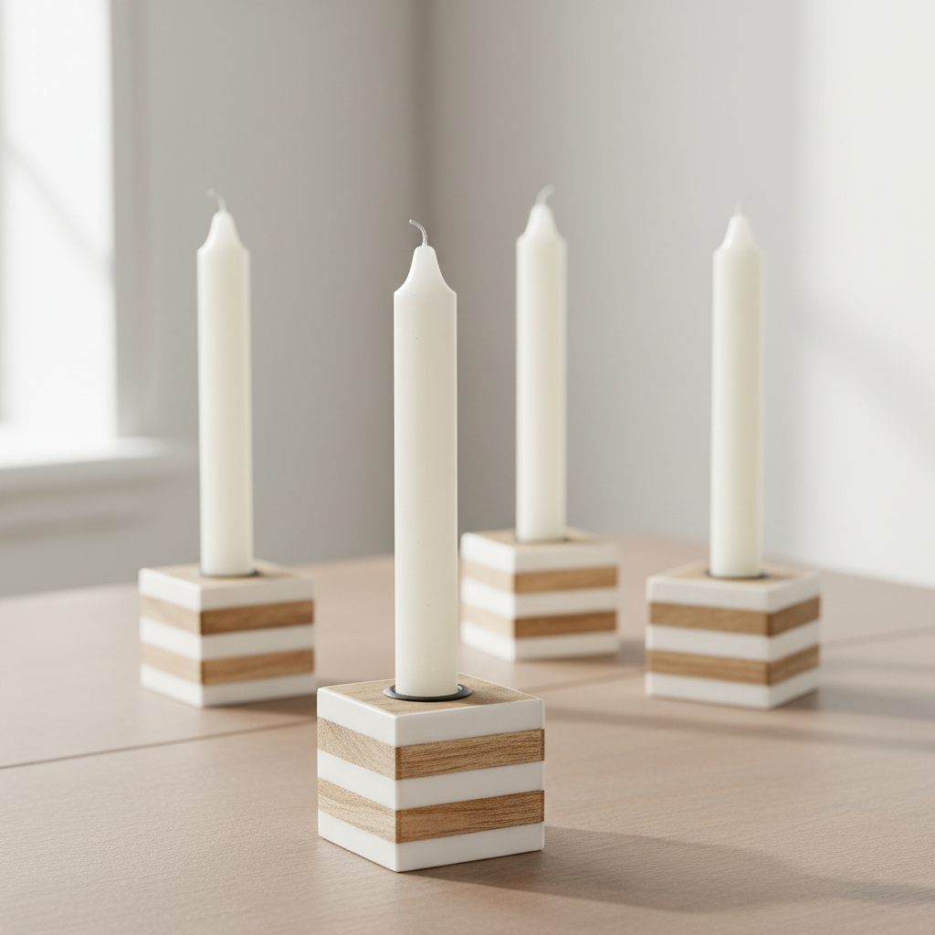 Moderne houten kaarsenhouder met subtiele witte strepen