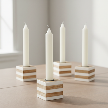 De Kandelaar “Stripes” combineert warm natuurlijk hout met een fris, modern ontwerp. Het strakke vierkante model en de witte strepen geven deze kaarsenhouder een eigentijdse uitstraling die perfect past in Scandinavische, moderne en minimalistische interieurs. Ideaal voor een standaard tafelkaars en compact genoeg om neer te zetten op tafel, vensterbank, plank of dressoir.