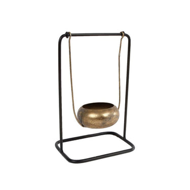 Breng sfeer in huis met de theelichthouder Kyan S, een stijlvolle combinatie van zwart metaal en een goudkleurige hangende kaarskom. Deze hangende kaarshouder is niet alleen functioneel, maar ook een subtiele blikvanger in je interieur. De houder is perfect voor een theelichtje en verspreidt een warm, uitnodigend licht – ideaal voor avonden op de bank of als sfeervolle decoratie op een kast, tafel of vensterbank.