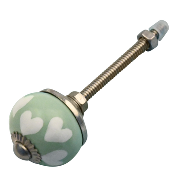 Breng een charmante en speelse sfeer in huis met deze porseleinen meubelknop met hartjes. De subtiele groentint in combinatie met beige hartjes maakt deze kastknop een echte blikvanger, ideaal voor kinderkamers, ladekasten of andere meubelstukken die wel een vrolijke touch kunnen gebruiken. Het sierlijke zilverkleurige beslag zorgt voor een stijlvol accent.
