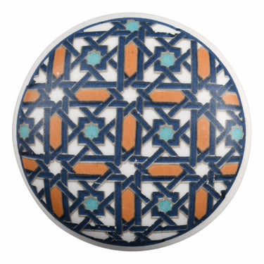 Geef je meubels een stijlvol en tijdloos accent met de Meubelknop 40mm Happy Industrial II. Deze porseleinen meubelknop heeft een verfijnd mozaïekpatroon in diepblauw, warm oranje en subtiel turquoise. Het geometrische ontwerp is geïnspireerd op klassieke mediterrane en Moorse tegelkunst, waardoor deze knop moeiteloos charme en karakter toevoegt aan elk meubelstuk.