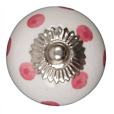 White cabinet knob with dark pink polka dots and silver-colored rosette