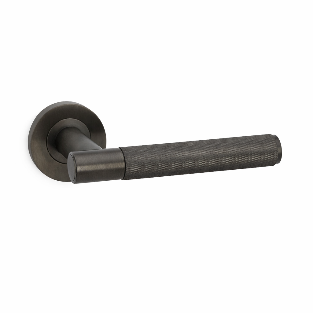 Industrial-luxe door handle with diamond-knurled grip on a slim round rose