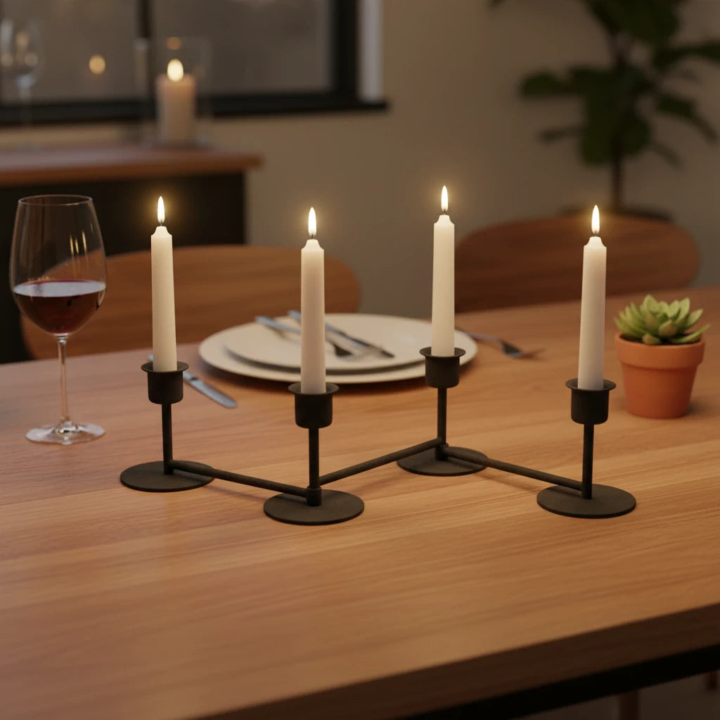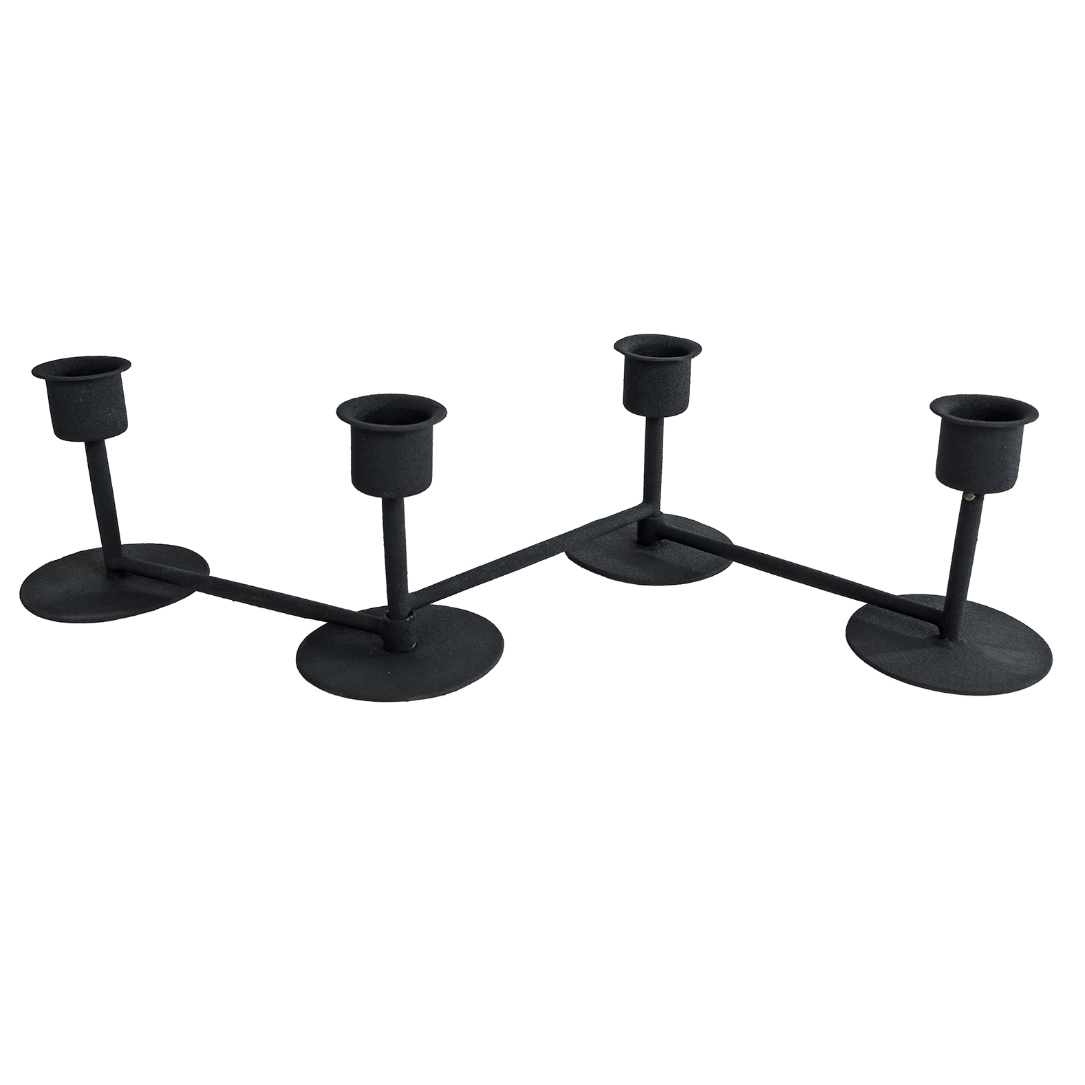 Sleek and purposeful, Zig Zag delivers four points of glow in a compact, low silhouette that stays below the sightline. The matte black metal and clean geometry bring a modern-industrial note to dining tables, sideboards or sills. Standing steady on round base plates, it styles easily—use solo for a quiet centrepiece or pair with other holders for calm, symmetrical balance.
