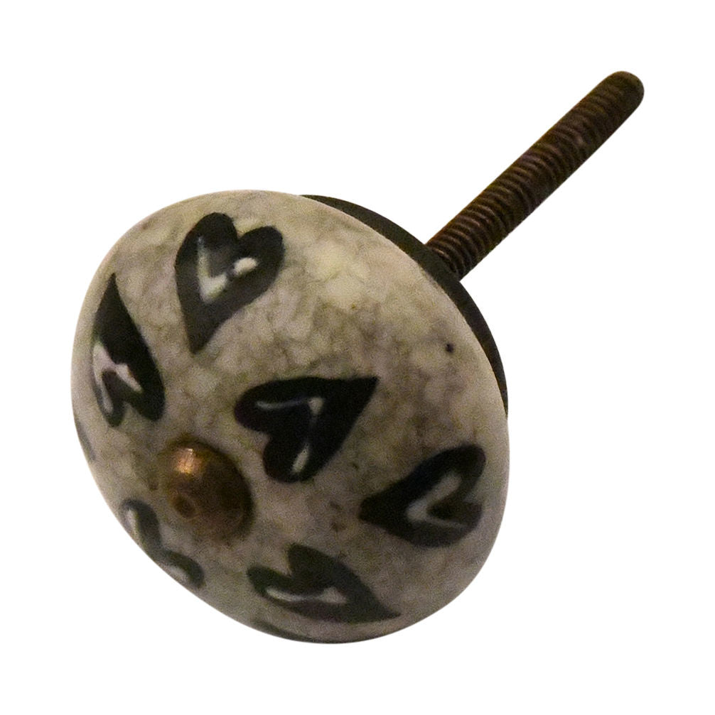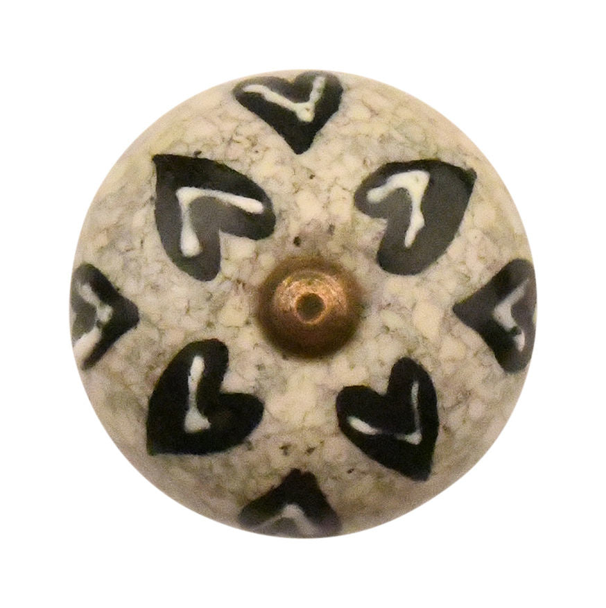 Grey-beige porcelain knob with black and white hearts