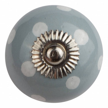 Give furniture a fresh, vintage lift with this grey porcelain knob featuring neat white dots and a tidy silver-coloured rosette and cap. The rounded profile sits comfortably in the hand, bringing a soft, refined touch to kitchens, dressers and bedside tables.