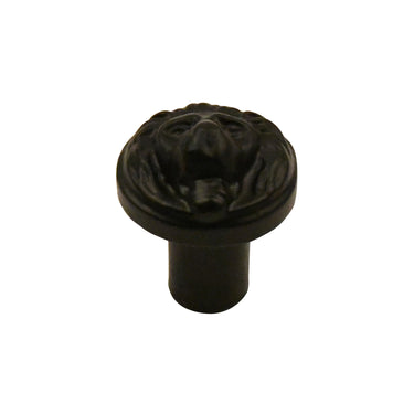 Gietijzeren kastknop met decoratieve leeuwenkop in zwart of roest