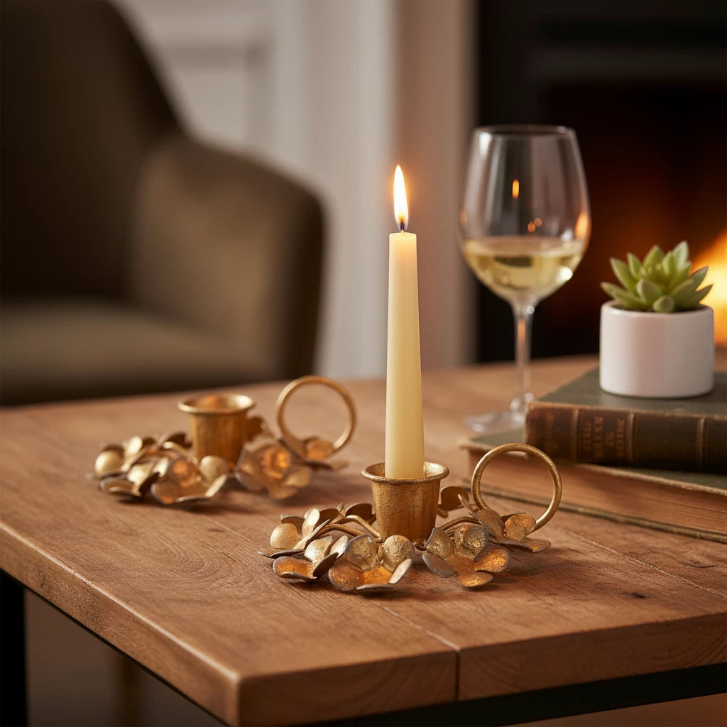 Breng warm, feestelijk licht in huis met kandelaar Nore. De open bloemrozet en de goudkleurige afwerking geven je tafel, dressoir of vensterbank direct een elegante glans, zonder te overheersen.