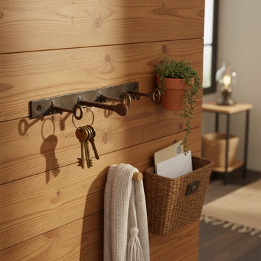 Geef je hal of keuken een stoer, circulair accent met kapstokje Keys. De haken zijn gemaakt van gerecyclede metalen onderdelen (o.a. sleutels) op een compacte strip in roest-look. Daardoor oogt elk exemplaar net even anders en krijgt je wand direct karakter—ideaal bij industrieel en vintage interieurs.