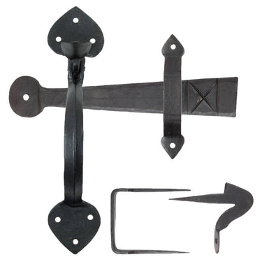 Geef je (binnen)deur of poort een authentieke upgrade met dit smeedijzeren klinkstel in gotische stijl (ook bekend als Suffolk latch). De zichtbare hamerslag, donkere bijenwasafwerking en de decoratieve harten zorgen voor een karaktervolle uitstraling die past bij landelijk, historisch en cottage-interieur.