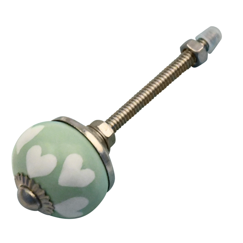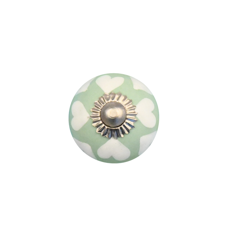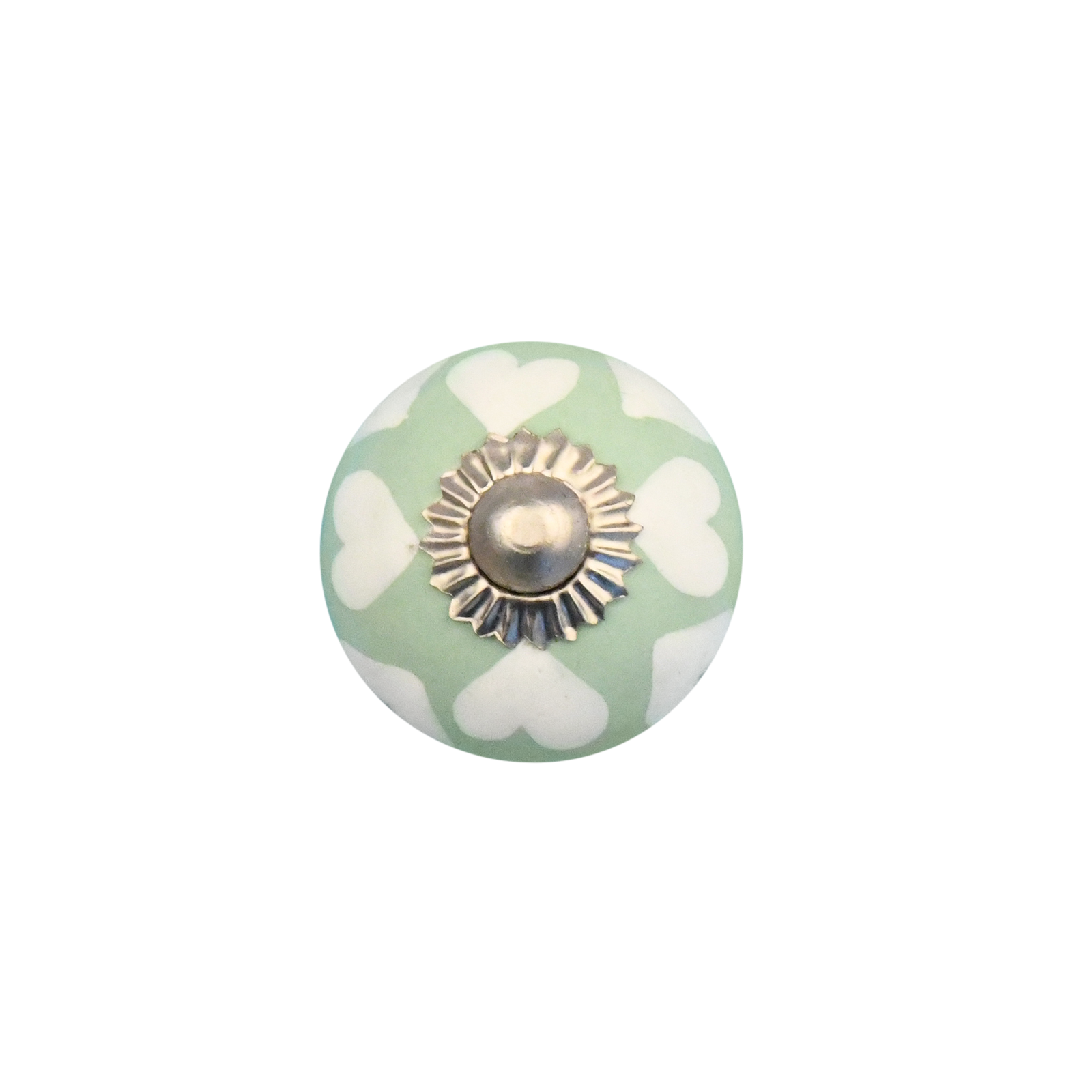Breng een charmante en speelse sfeer in huis met deze porseleinen meubelknop met hartjes. De subtiele groentint in combinatie met beige hartjes maakt deze kastknop een echte blikvanger, ideaal voor kinderkamers, ladekasten of andere meubelstukken die wel een vrolijke touch kunnen gebruiken. Het sierlijke zilverkleurige beslag zorgt voor een stijlvol accent.