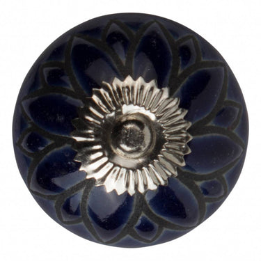 Deze porseleinen meubelknop is uitgevoerd in donkerblauw met een verfijnd zwart bloemmotief en afgewerkt met een zilverkleurig kroontje en voetplaatje. Het klassieke ontwerp voegt een stijlvol detail toe aan zowel nieuwe meubels als restauratieprojecten.
