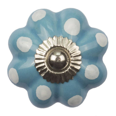 Vrolijk je meubels op met deze bloemvormige porseleinen knop in lichtblauw met witte stippen. Het zilverkleurige rozet geeft een frisse, vintage touch die perfect past bij dressoirs, commodes en keukenkastjes—ook ideaal als speels detail in de kinderkamer.
