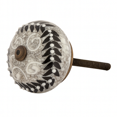 Breng karakter in je interieur met deze stijlvolle porseleinen meubelknop van 40 mm. De kastknop combineert een warme grijs/crème ondergrond met een klassiek motief van zwarte blaadjes, subtiel afgewerkt met witte stipjes in reliëf. Dit zorgt voor een speels, decoratief effect dat zowel bij vintage als landelijke stijlen past.