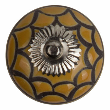 Geef je kasten en lades een warme, nostalgische look met deze porseleinen meubelknop in oud geel. De strakke zwarte belijning rondom de knop en het zilverkleurige beslag zorgen voor een subtiel grafisch accent dat past bij landelijk, retro en bohemian interieurs.