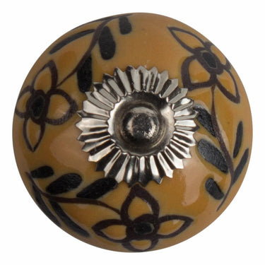 Breng een warme, nostalgische sfeer in je interieur met deze porseleinen meubelknop in oud geel. Het zwarte bloemenmotief en het zilverkleurige beslag geven kasten en lades een speels, tijdloos accent dat past bij landelijk, retro en bohemian stijlen.