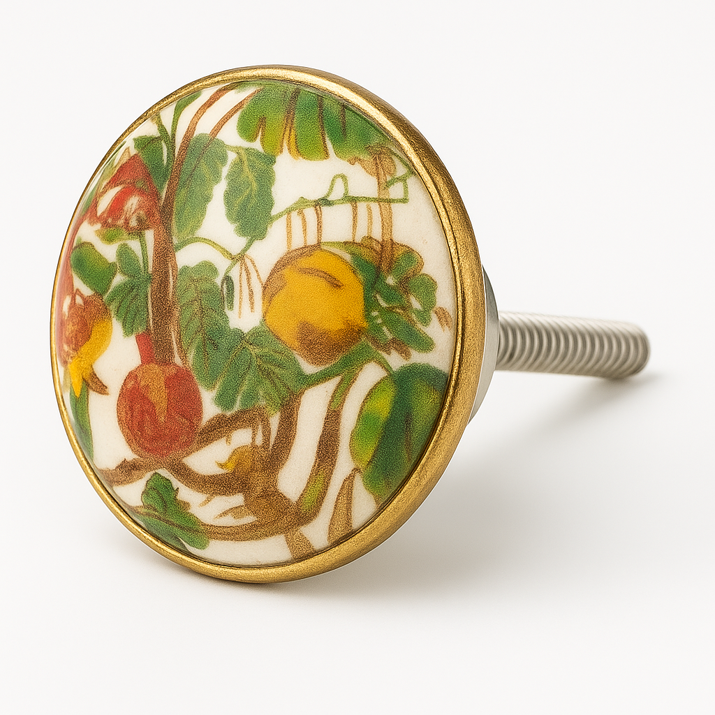 Geef je meubels een warme en levendige uitstraling met deze ronde porseleinen knop met een botanisch bloemenmotief. Het ontwerp bestaat uit kleurrijke bloemen en bladeren in rood, geel en groen op een crèmekleurige achtergrond, afgewerkt met een subtiele goudkleurige rand. Deze porseleinen kastknop is een decoratief accent met klassieke charme, perfect voor liefhebbers van natuurlijke prints en vintage details.