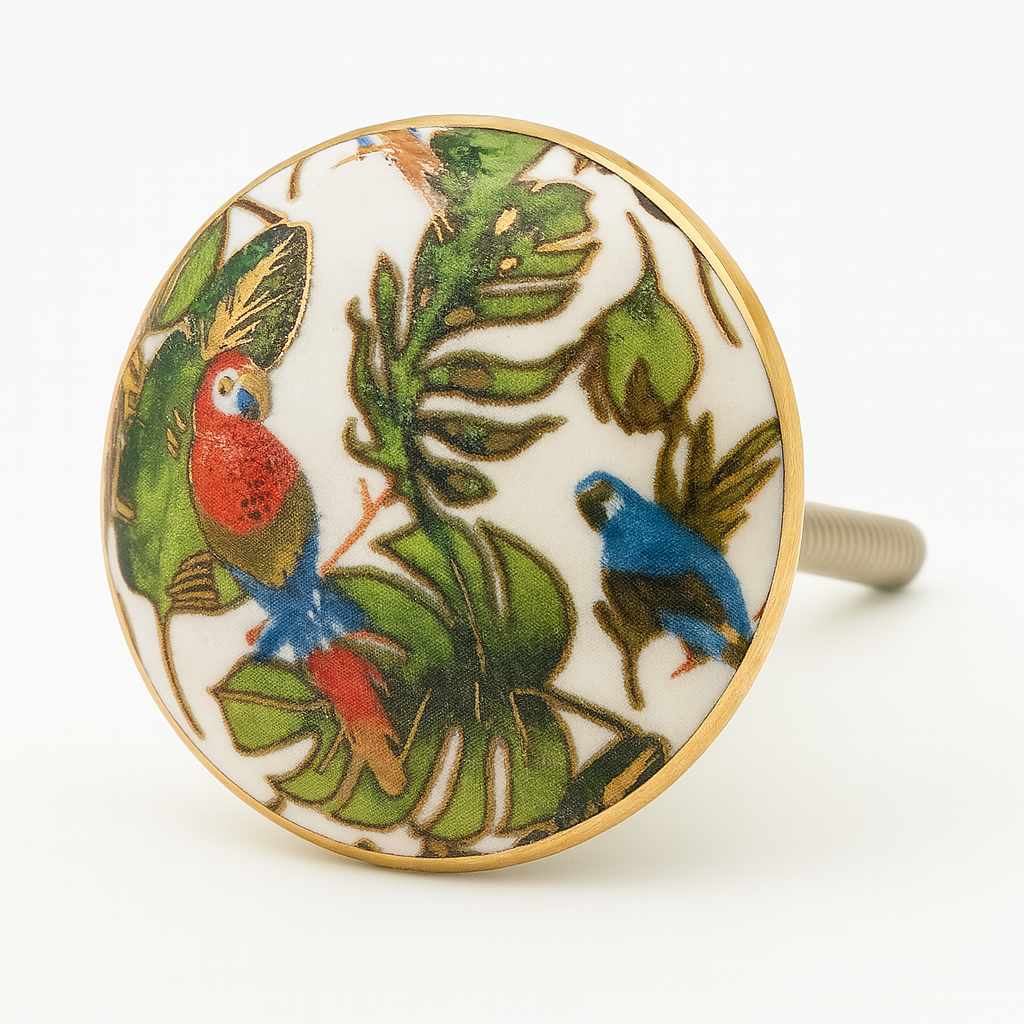 Breng kleur, speelsheid en karakter in je interieur met deze ronde porseleinen knop met tropische vogels. De levendige illustratie toont kleurrijke papegaaien tussen grote groene bladeren, afgewerkt met een subtiele goudkleurige rand. Deze porseleinen kastknop is perfect voor iedereen die een exotisch detail wil toevoegen aan zijn meubels, of je nu een kinderkamer inricht, een ladekast opfrist of een keuken een vrolijke twist geeft.