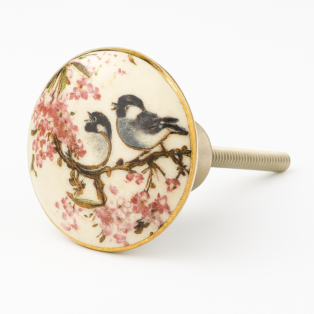 Porseleinen kastknop met romantisch bloesemdesign en vogelmotief