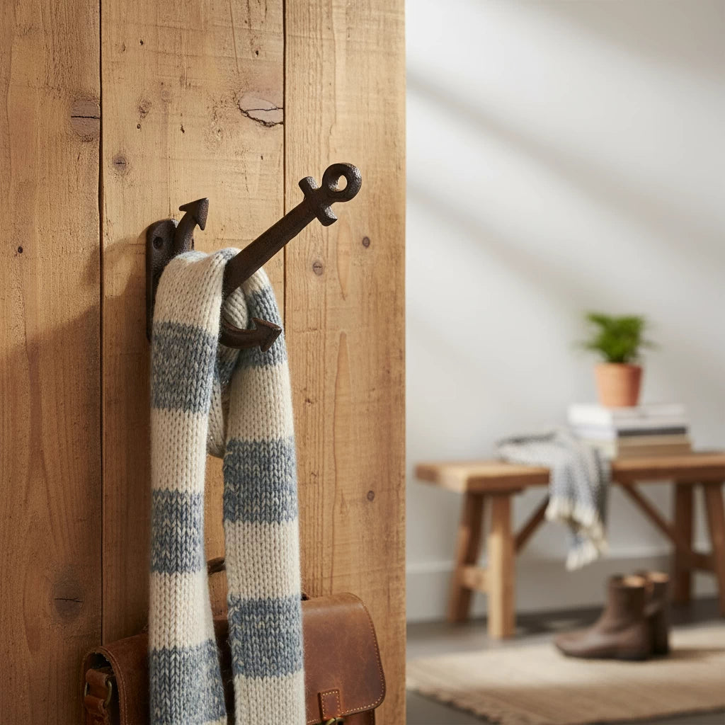 Geef de wand een stoer maritiem accent met de wandhaak Anchor Odd. Deze compacte haak van massief gietijzer heeft een robuust anker-silhouet met subtiele details die direct karakter toevoegen aan hal, badkamer of bijkeuken. De oud-bruine afwerking past perfect bij hout, touw en andere natuurlijke materialen, waardoor je moeiteloos een warme, rustieke sfeer creëert.