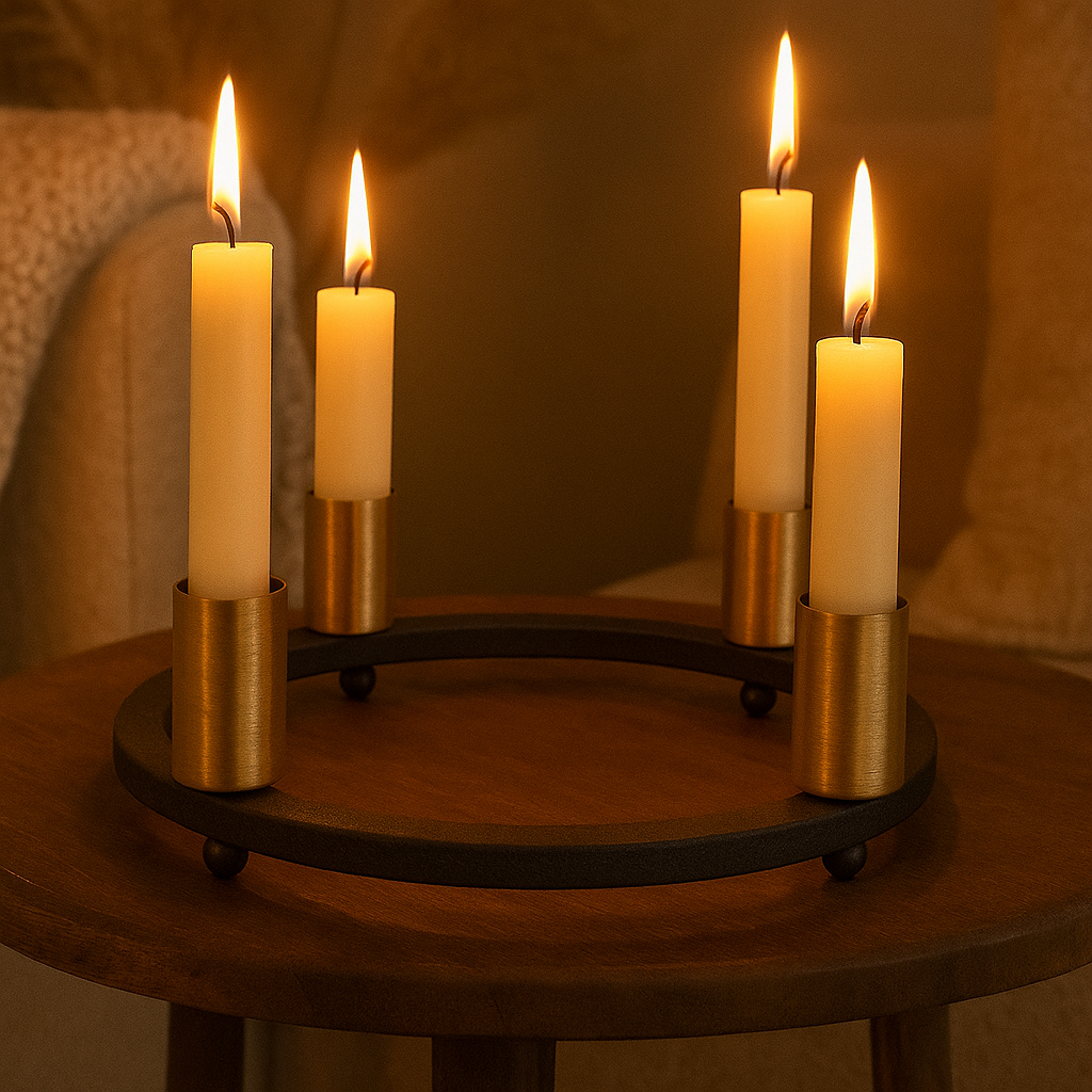 Geef je tafel, dressoir of vensterbank direct sfeer met Yono: een compacte, ronde kaarsenring in zwart metaal met goudkleurige houders. Kies de variant die bij jouw setting past: kandelaar (dinerkaars) of theelichthouder, beide in een modern-rustieke look die moeiteloos combineert.