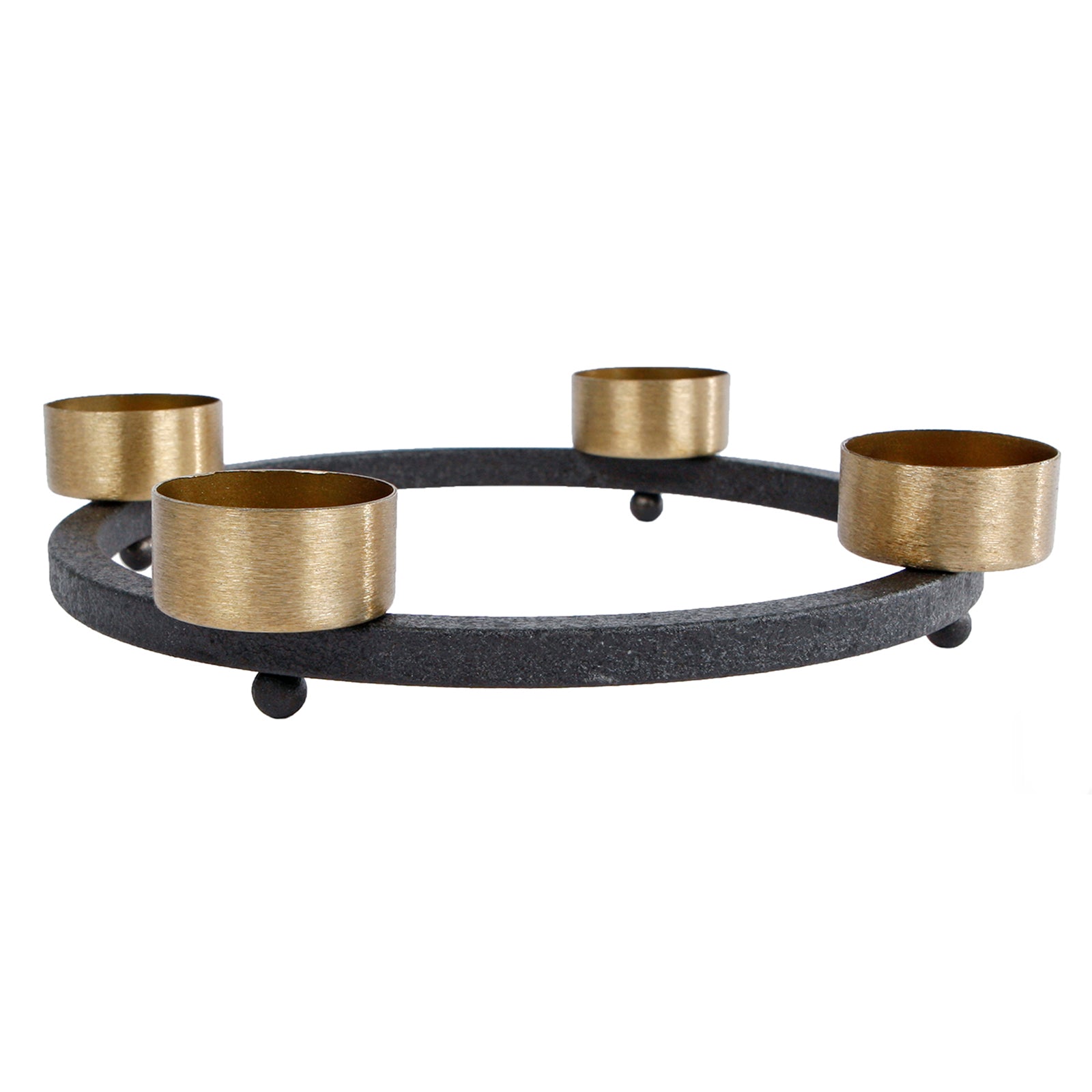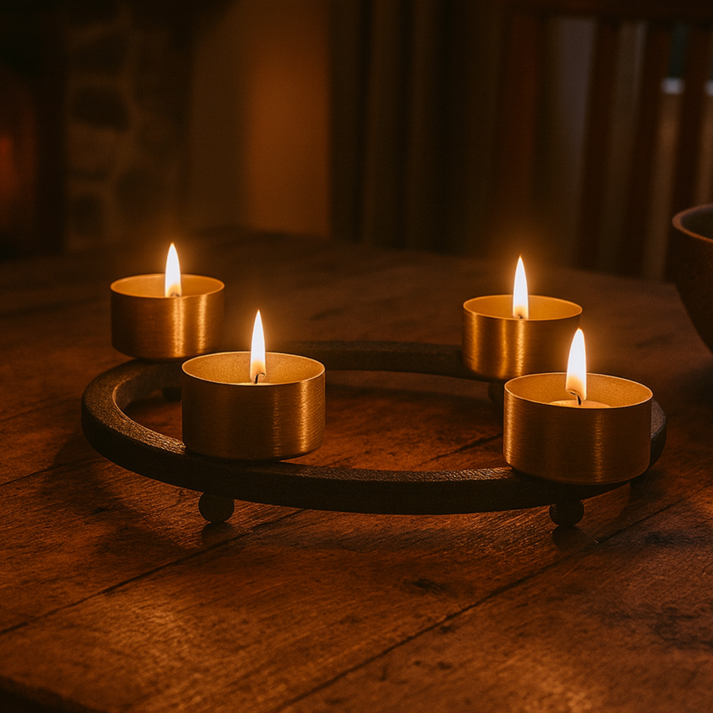 De solide ring staat stabiel op kleine pootjes, terwijl de geborsteld-gouden cups voor een warme gloed zorgen. Dankzij het S-formaat is Yono ideaal als subtiele centerpiece—solo of gegroepeerd met andere maten.
